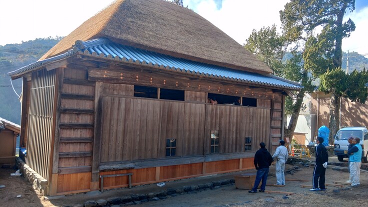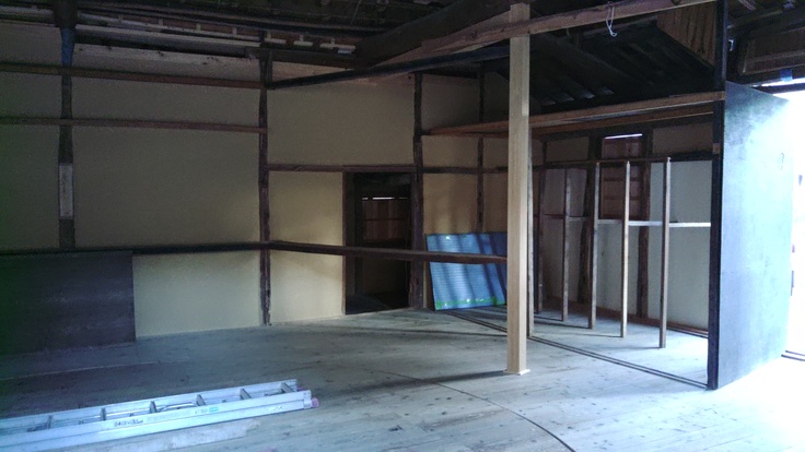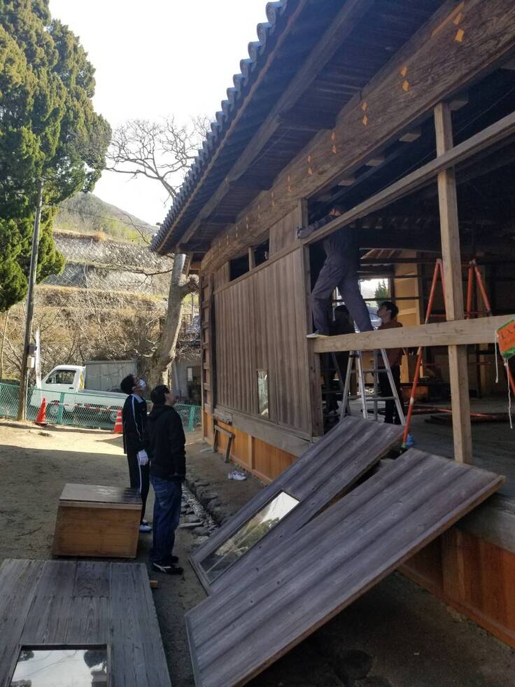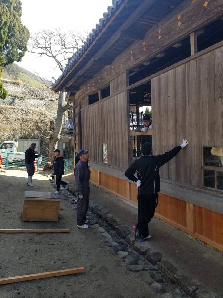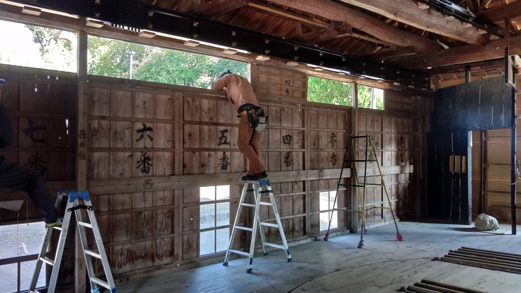 外装の工事がほぼ終了し、内装工事が進む中山の舞台。本日は、工事をしてくださっている建具屋さんから、表の雨戸がすんなり入るかどうか確認したいので、戸板を入れてみてくれますか?との依頼があったので、保存会メンバー数人が集まり作業を行ってきました。