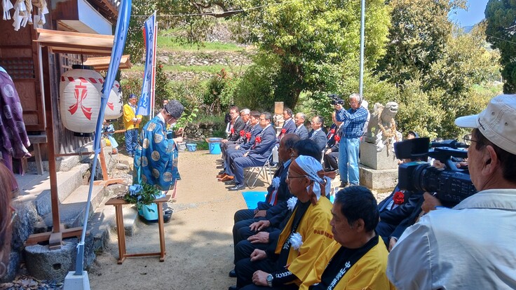 4月14日日曜日、中山の舞台では大規模改修工事落成式が行われました。中山地区では朝早くから中山自治会・中山農村歌舞伎保存会のメンバーが集まり、境内の清掃や舞台の飾りつけを行いました。