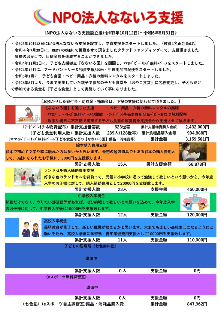 NPO法人『なないろ支援』では、当法人役員からの個人的な寄付金、正会員会費、READYFOR継続寄付にて皆様からお預かりした支援金、企業・団体様からお預かりした助成金は全額を子ども達への支援の為に使用します。