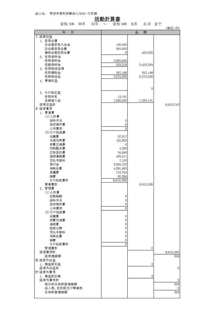 お預かりした支援金や助成金にて支援活動を実施させて頂いておりますが、当法人メンバーは支援活動は無償でできる範囲で実施すると決めて活動しておりますので、支援金を人件費として使用した事は一円もありませんし、今後も人件費として使用する事はありません。