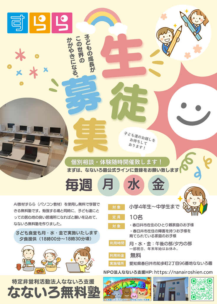 《すべての子どもたちに学ぶ機会を》と考え、令和3年10月12日にNPO法人『なないろ支援』を立ち上げ活動しております。子ども達と障害のある子どもがいる家庭やひとり親家庭に長期的な支援を続けて行く為に、できる事を地道に続けて行こうと思っております。