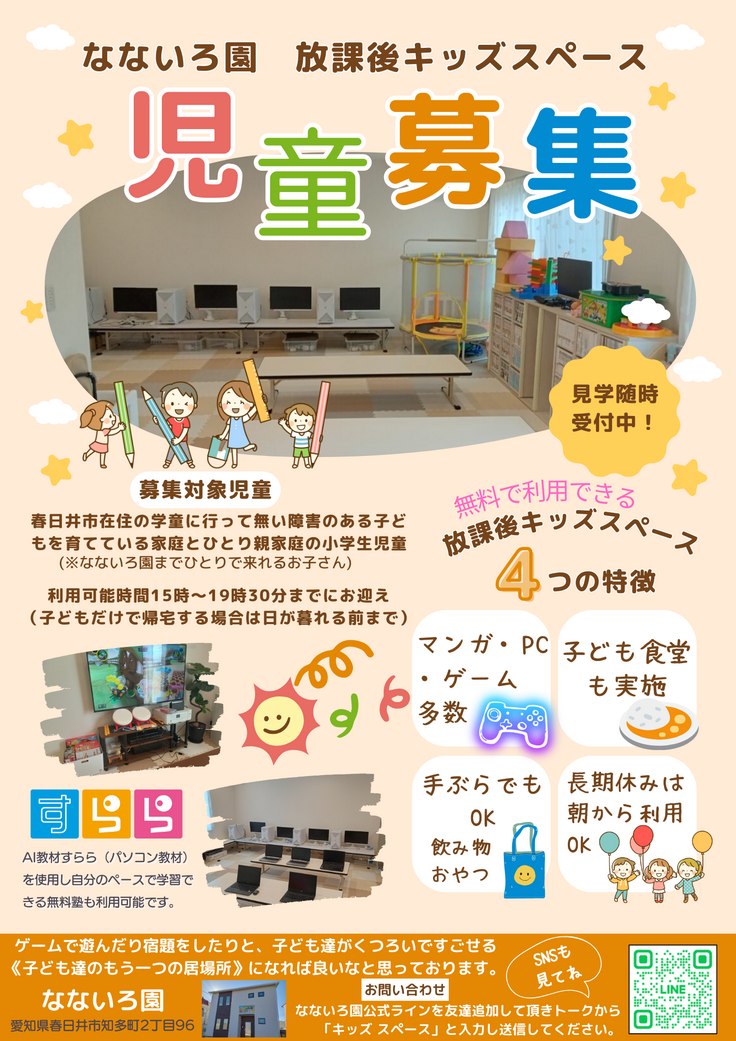 【なないろ園】は、愛知県市知多町二丁目96番地に、2022年12月1日に開園させていただきました、NPO法人なないろ支援の運営する子ども支援拠点です。
