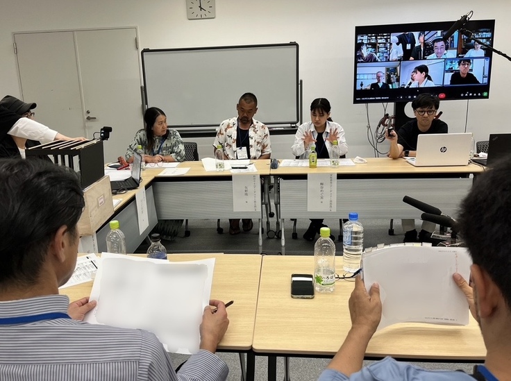 都合のつかないメンバーはオンラインでつなぎながらの通し読み合わせ。