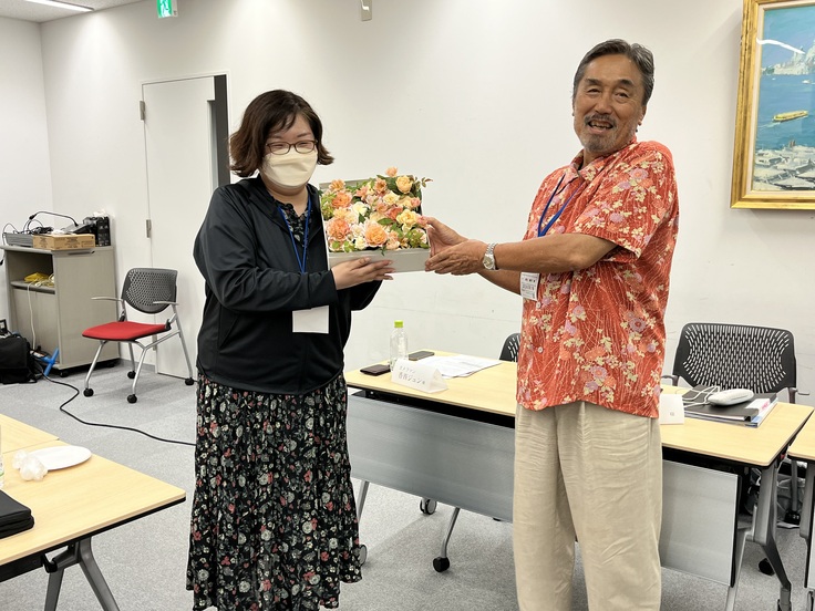 終了後には、先日、直木賞をご受賞なさった一穂ミチさんにメンバーからお祝いの花束が送られました。