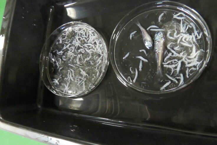 写真に写っているのは、ほとんどハダカイワシの仲間のようです。私たちの研究対象のひとつです。(茂木)