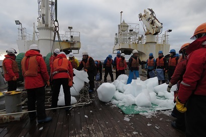 観測を続けながら東に進んでいます。例年120°Eより東に行くと氷山がパタリとみられなくなります。ということで、見えるところにあるうちにアイスオペレーションの発令です。棚氷から崩れた氷が漂っている、アイスオペレーション向きな氷山が見つかり作業開始となりました。氷キャッチャーでちょうどよいサイズの氷を拾っていきます。デッキ上で皆で氷を切ったり、割ったりして袋詰めしました。