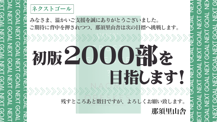 このあと、すこしご支援機関が残っておりますので、「ネクストゴール(出版部数の拡大)」を設定いたしまして、近々、プロジェクトページに反映する予定でおります。引き続き、何卒、よろしくお願い申し上げます(バナーをご参照ください)。