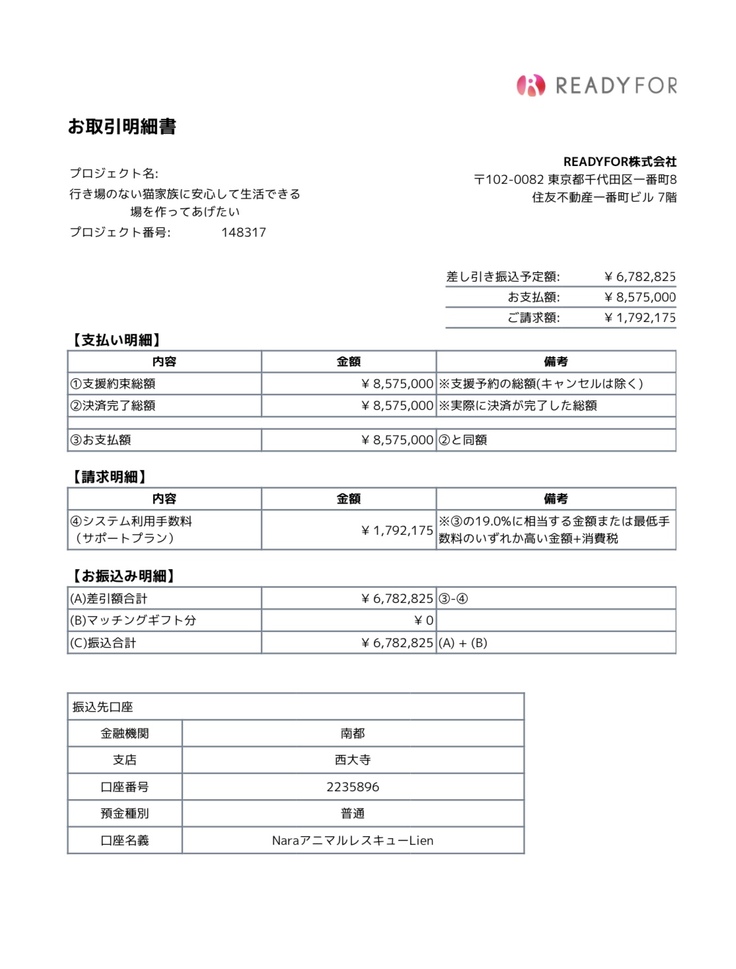 本日、SECOMの明細書を確認できましたので、皆さまからのご支援金6782825円を全て使わせていただきましたので、最終報告となります。