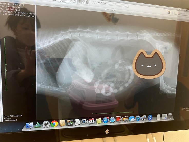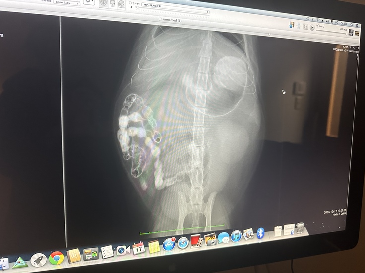 胃内にあった2cm大の異物ははっきり写りませんでしたが、バリウムは腸管へ流れているので通過障害は起こしていないそうです。