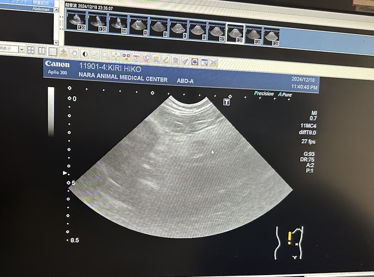 5日前から膵炎発症し、相当お腹が痛かったでしょうと。詳しい採血結果を待たないと確定診断できないそうですが、膵臓の周囲が肥厚しているので膵炎に間違いないということで治療開始して頂きました。