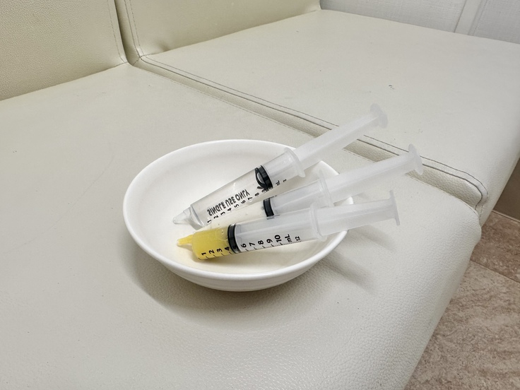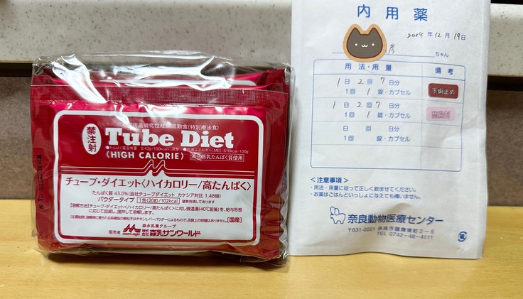 このチューブから薬と一緒に1日34gの高カロリー食を3回注入します。下痢も酷いので、排便状況を観察しながら不足分の水も補給していきます。