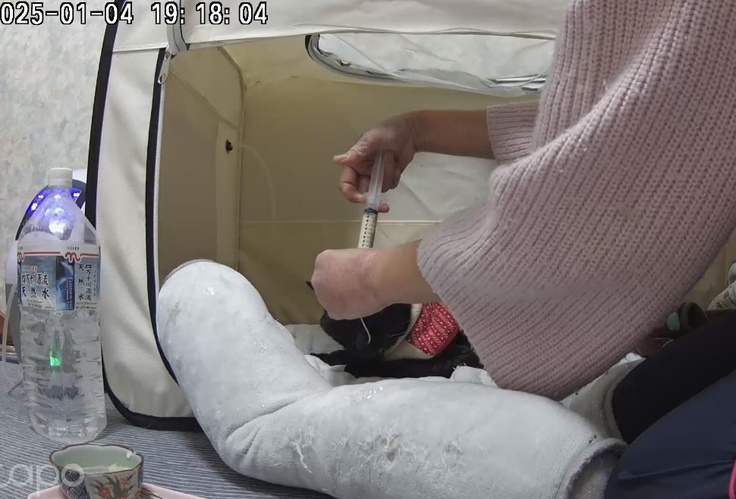 呼吸状態が悪かったので酸素室へ入れて、朝の注入は中止して仕事に行きました。