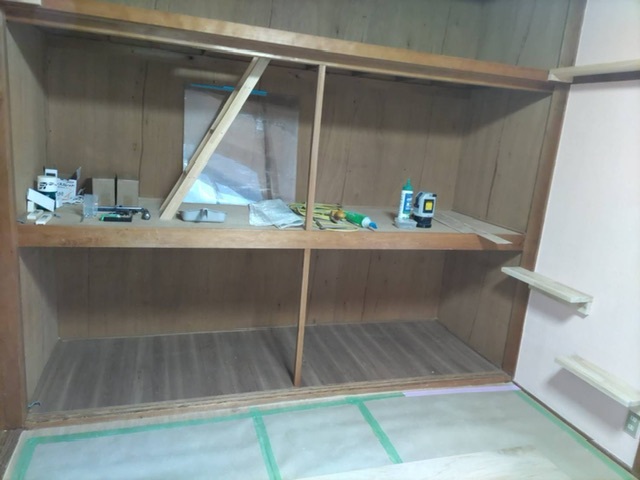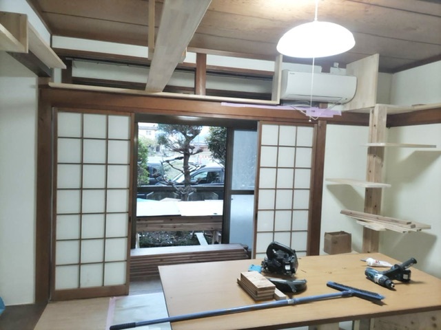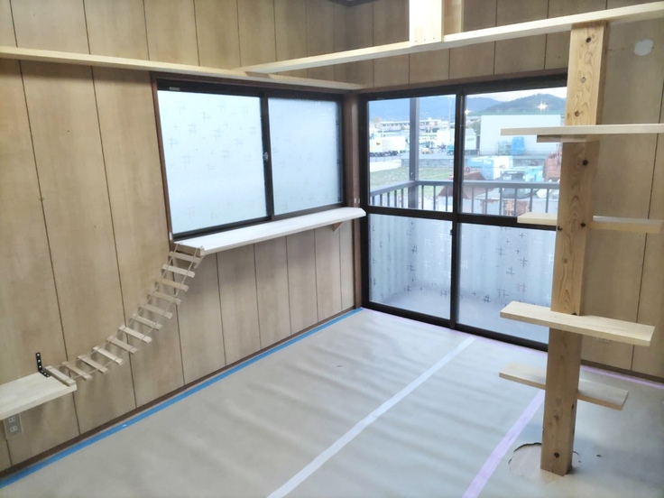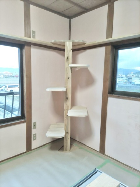 そして、まだ途中経過ですがそれぞの部屋にはキャットウォークとキャットタワーを作って下さってます。大工さんって何でも出来るんですね〜