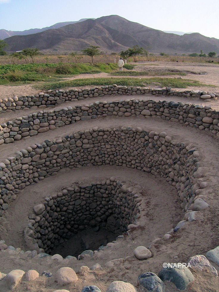 ナスカ市街東部のカンタヨックには、渦巻き型に底に降りる形式の井戸が十数個並んでいます。これらの井戸の底は地下の水流でつながっています。