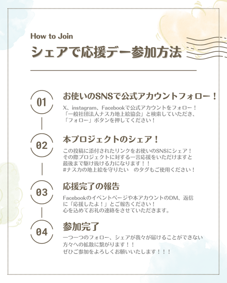 皆さんの拡散により、多くの方にこのプロジェクトを知っていただける可能性が高まり、地上絵保護の第一歩を踏み出すことへと繋がっていきます!!