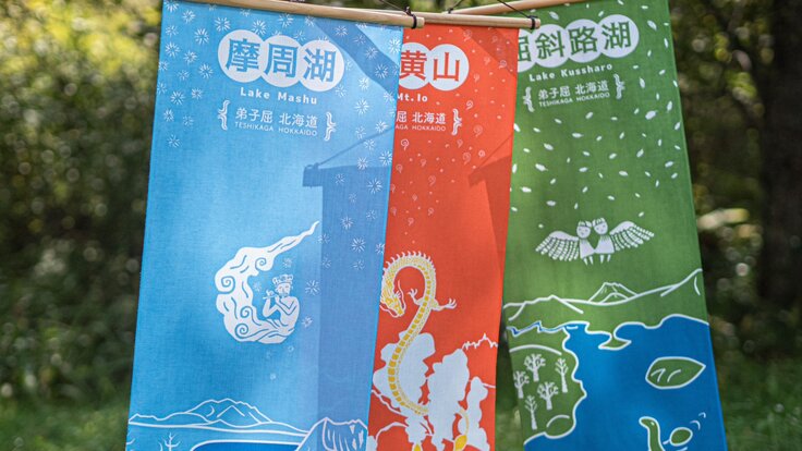 こちらは、弟子屈町でデザインスタジオを営む「トリオデザイン」さんが制作している手ぬぐいで、温泉の名所としても知られてる弟子屈町の観光地をデザインしたもの。