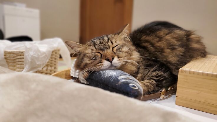 退院初日のなよすけです。マタタビの香りが付いた魚のおもちゃにスリスリしていました。