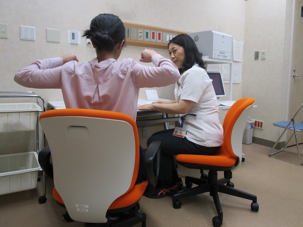 8階患者サポート研究開発センターでは手術前のリハビリテーションを行っています。手術後の肺合併症(肺炎など)を予防し、スムーズな手術後の機能回復を図る目的で手術前より練習を開始します。呼吸状態や運動機能を評価し、腹式呼吸練習や喀痰方法、頸部・肩甲帯のストレッチング、筋力及び持久力改善のための運動方法を個々の状態に合わせて紹介しています。