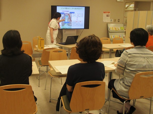 リンパ浮腫教室では、セラピスト資格を有する看護師が、リンパ浮腫予防に関する日常生活の過ごし方、セルフリンパドレナージに関する説明を行います。