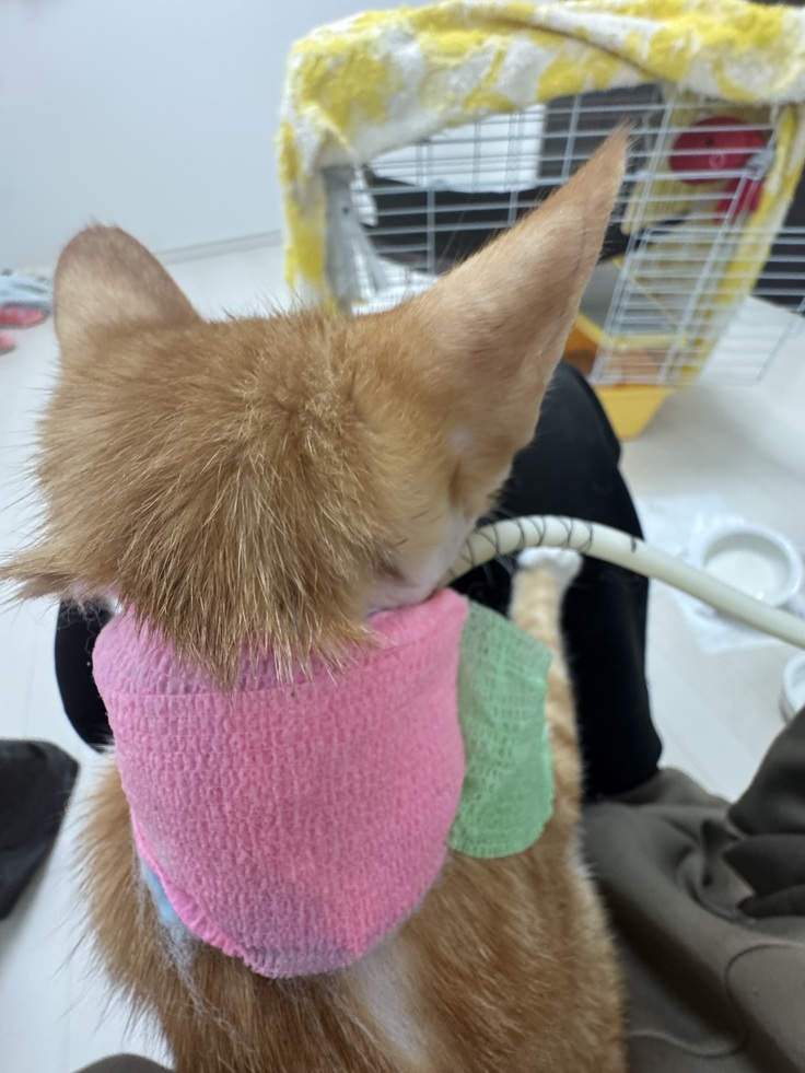 詳しい記載は避けますが、今回ぺろ君は右の頸部から食道チューブが設置されています。