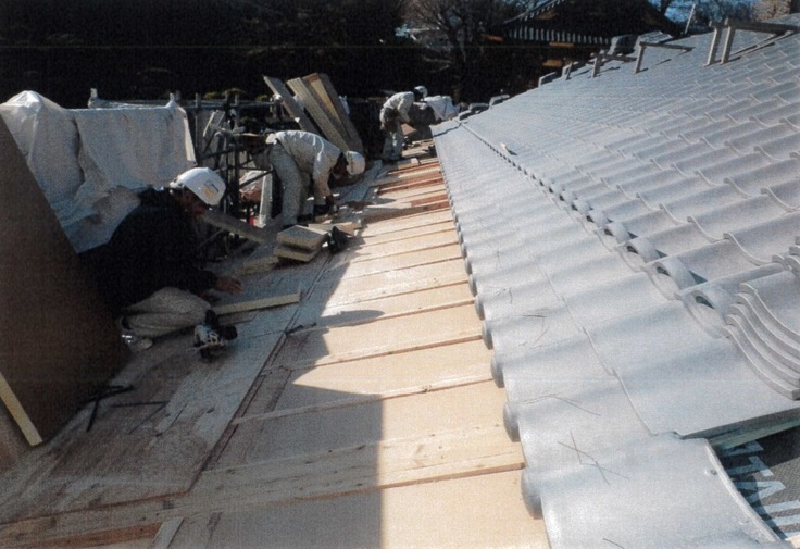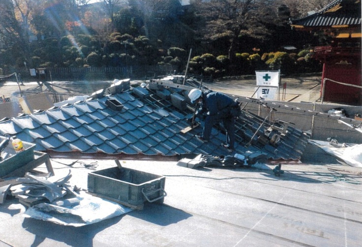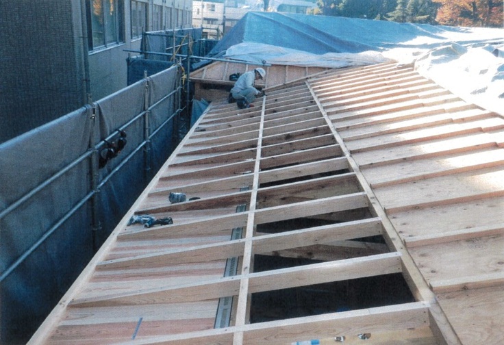 昨年12月頃から屋根の工事が始まり、徐々に瓦葺きが進み、昨日完了したところで、これから銅板葺きの部分が進められていきます。