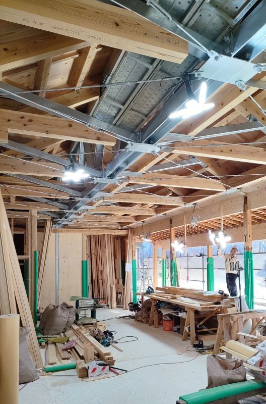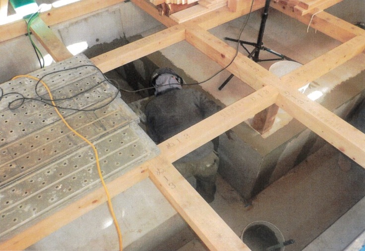 床下の設備や人通ピットの工事なども進み、床板が徐々に張られてきています。