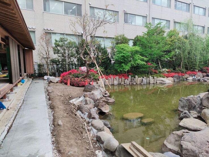 現時点の建物は外壁が出来まして、お庭にも池の片側の植栽はほぼ完成しております。
