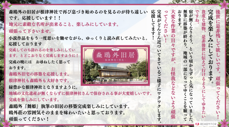 最終章のクラウドファンディングは、現在までに代理支援の方も含めまして、133名もの方々から温かいご支援をいただいております。ご支援者の皆様からは心のこもった応援コメントもたくさんいただいておりまして、日々励みになっております。