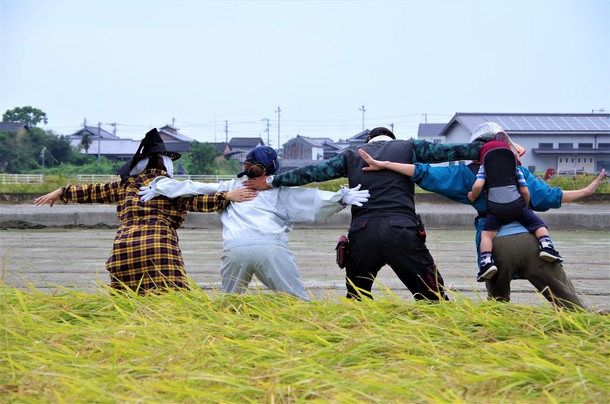 ご近所の稲刈り中の農家さんにお願いして、コンバインに乗せてもらったり、稲穂を持って踊ったり…