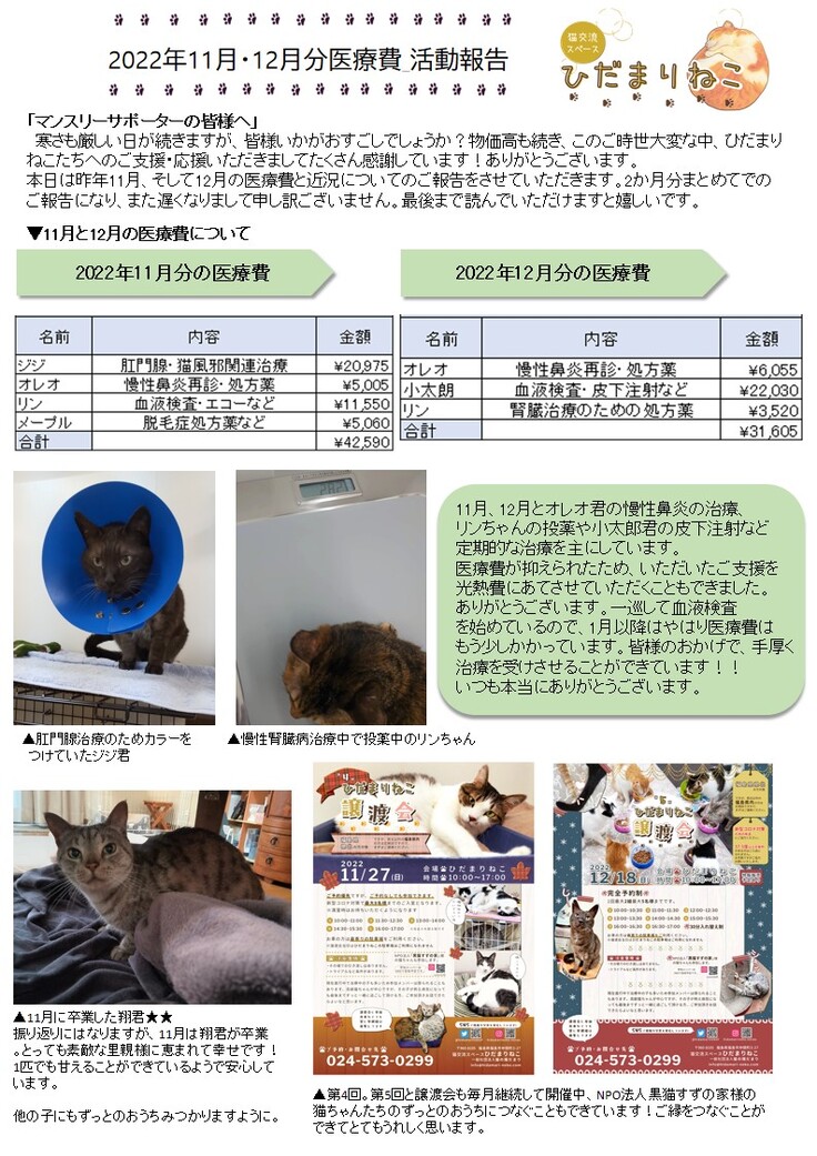 これからも、高齢猫が多いため、腎機能低下中の猫の定期的な検査も含め、また突発的な医療費がかかることもあります。きちんとご報告してまいります。