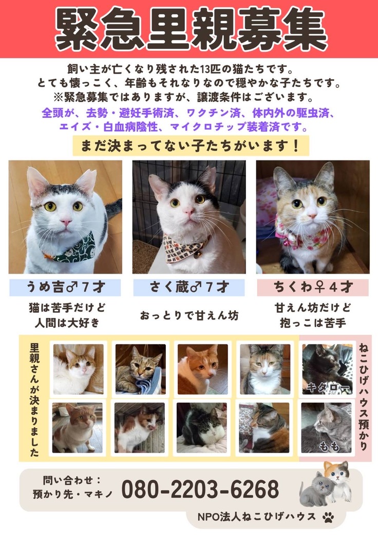 娘さんが急に亡くなってしまい、お母様はかなり高齢のため猫たちのお世話ができなくなりました。