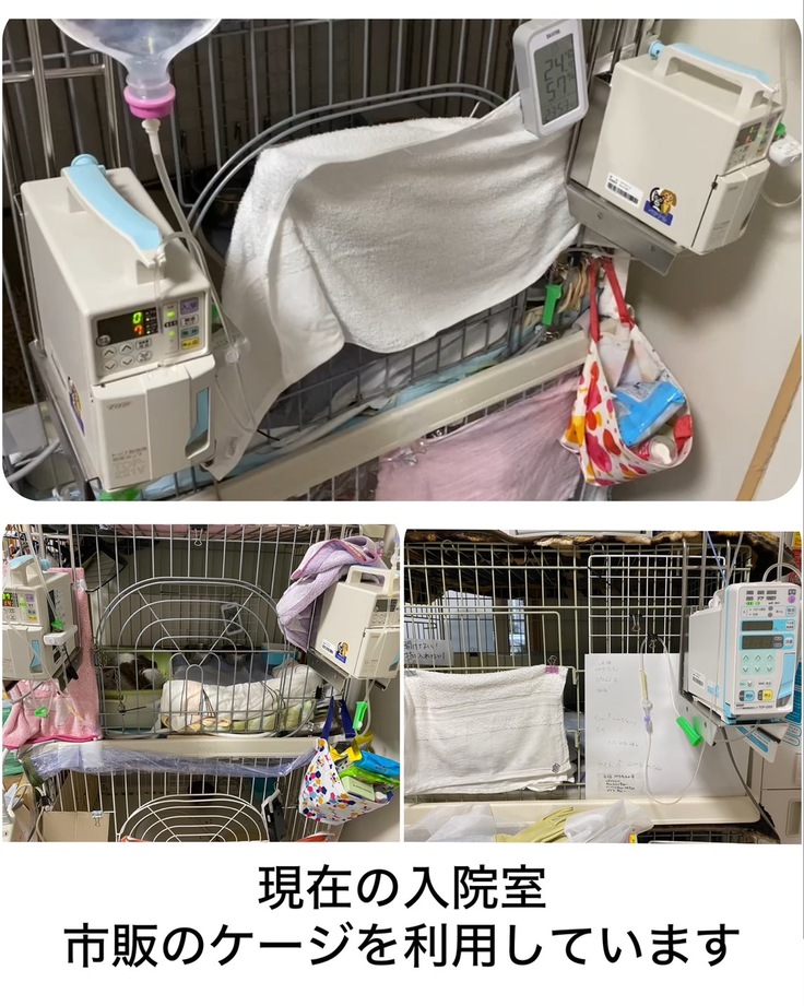 そのような子たちを保護・ケアをするために、現在、一般に市販されている網状のケージ4台を入院室として使用しています。