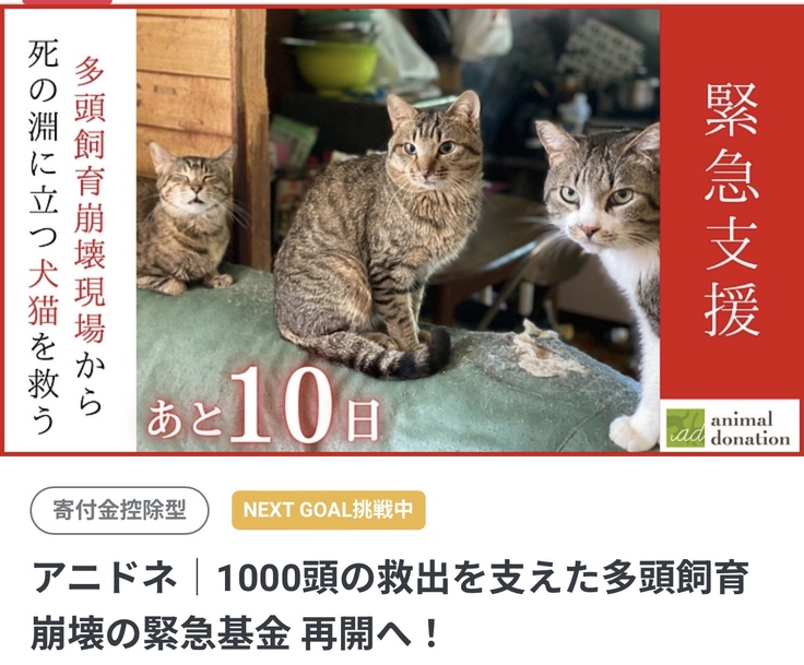 本日は、12月25日(月)に終了する、「公益社団法人アニマル・ドネーション」さんのプロジェクト「1000頭の救出を支えた多頭飼育崩壊の緊急基金 再開へ!」の紹介をいたします。