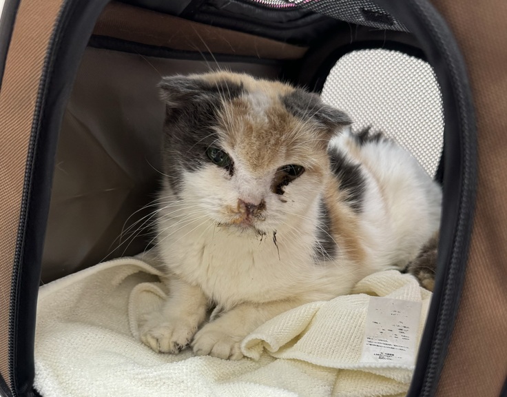 スコティッシュフォールドと思われ、かなり衰弱していました。すぐに病院へ。