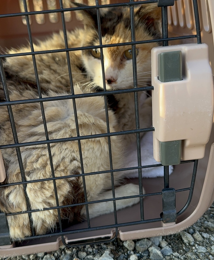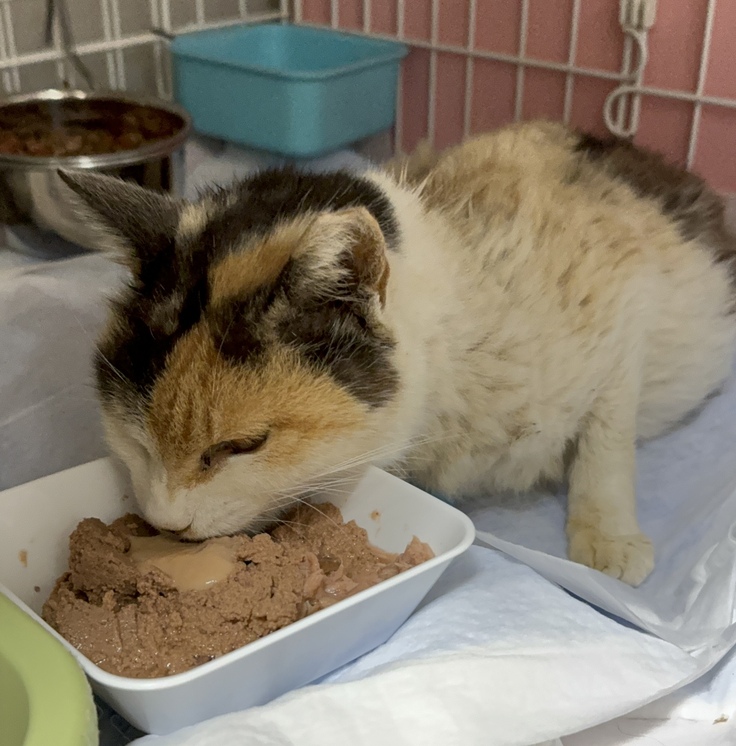 14日に具合の悪い猫さんを保護しました。レミちゃんと名付けました。体調が良くなさそうな猫がいると知らせを受けて近所だったので直ぐに向かいました。毛玉も全身にあり、痩せた体にお腹が異常に膨らんでいました。