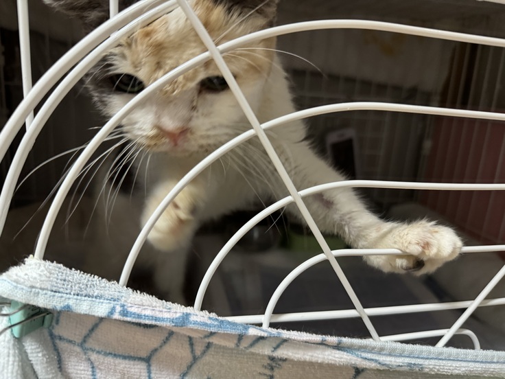 あかねちゃんには虐待をされた過去とトラウマがあります。左前脚に古い負傷があり、床に脚を着けることができません。その時の怪我が原因だそうて、人間不信があります。お世話も慎重に怖がらせないようにしていますが、ビックリしたり怖いと思った時には猫パンチをします。でも少しずつですが心を開いてくれいると感じます。