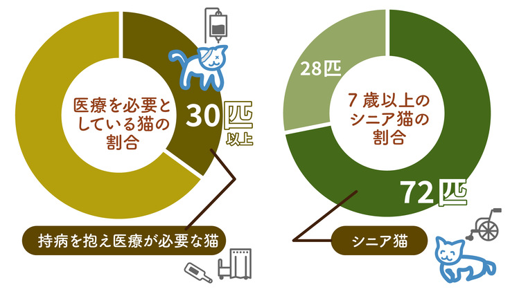 ねこひげハウスには、現在、治療食が必要だったり、毎日の投薬治療を受けている猫が30頭以上、シニアと言われる7歳以上の猫が70頭以上暮らしています。腎臓病やてんかんなどの疾患を持った子や、やむなく脚を切除された子、目の見えない子も複数頭います。