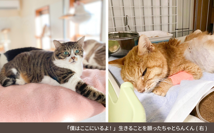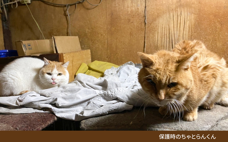 2022年1月に保護したちゃとらん君は、19年間という猫生のほとんどを狭くて暗い小屋で、適正とは言えない状態で飼育され、全身毛玉だらけで劣悪な環境の中に放置されていました。そんな状況にあったにも関わらず、人にも猫にも優しくて甘えん坊な子で、そして何よりも「もっと生きたい!」という気持ちが伝わってくる強い子でした。