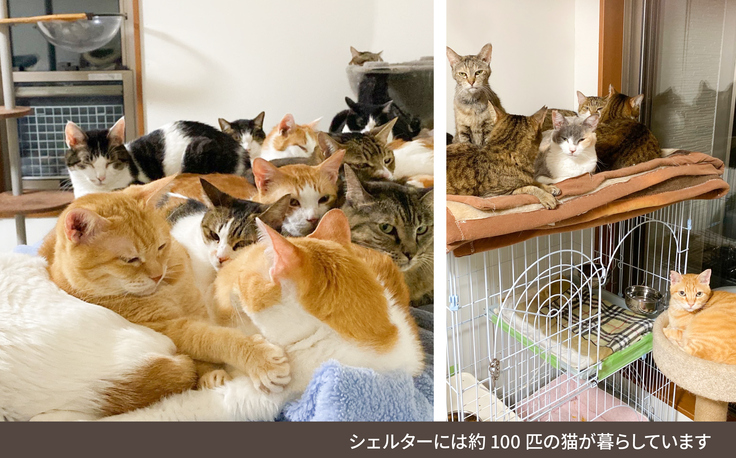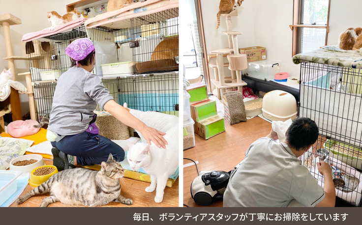 ねこひげハウスでは100頭ほどの猫たちのケアと清掃など、シェルター維持管理のために、代表をはじめボランティアメンバーが日々奮闘しています。