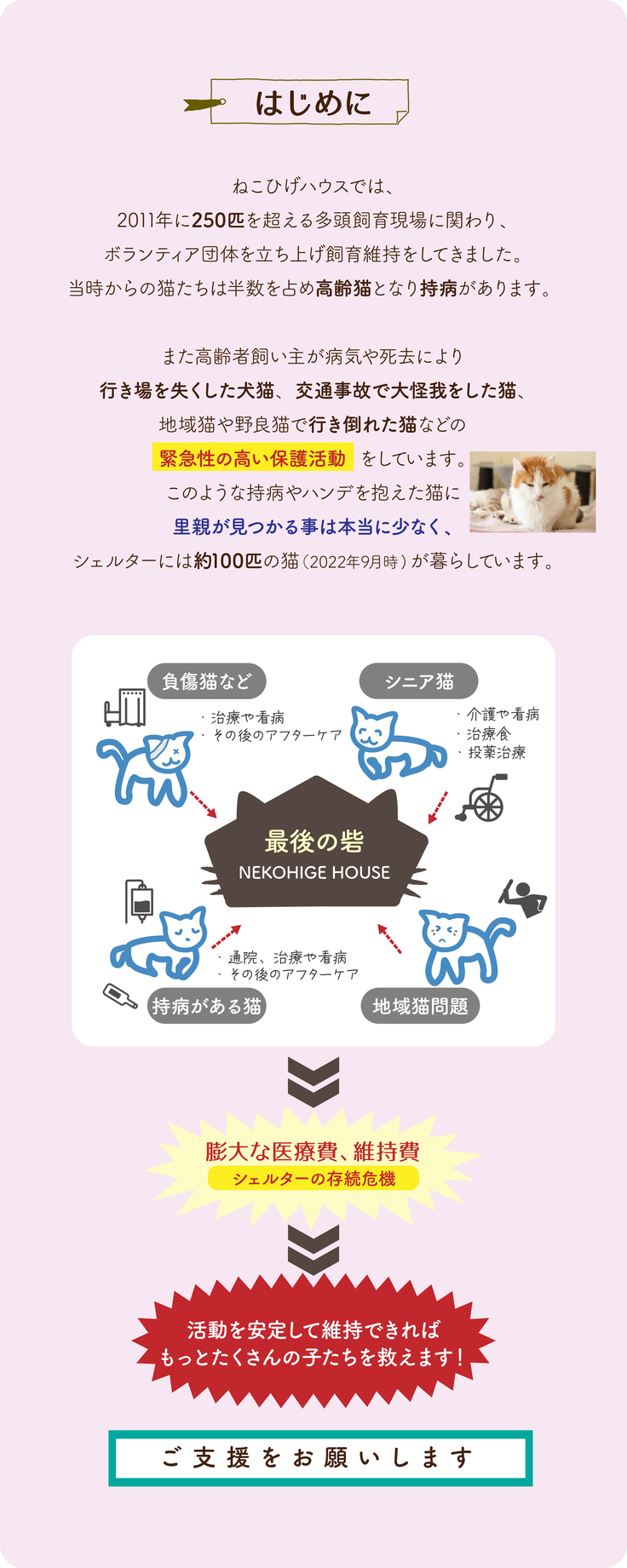 ねこひげハウスに皆さまの温かいご支援をよろしくお願いします。
