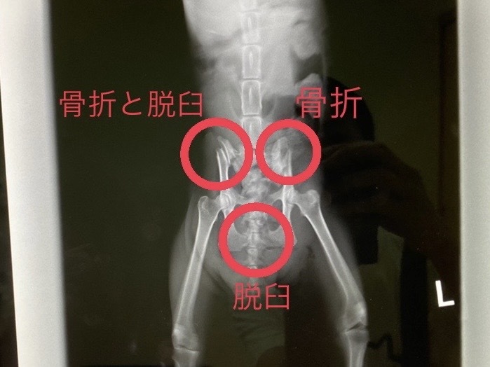 大けがでグッタリとしていて顔しか動かせない状態だったため、急いで病院へ向かいました。即入院となり、CTや検査の結果、骨盤内や大腸、尿道付近の損傷が明らかで、骨盤骨折と脱臼も数カ所ありました。