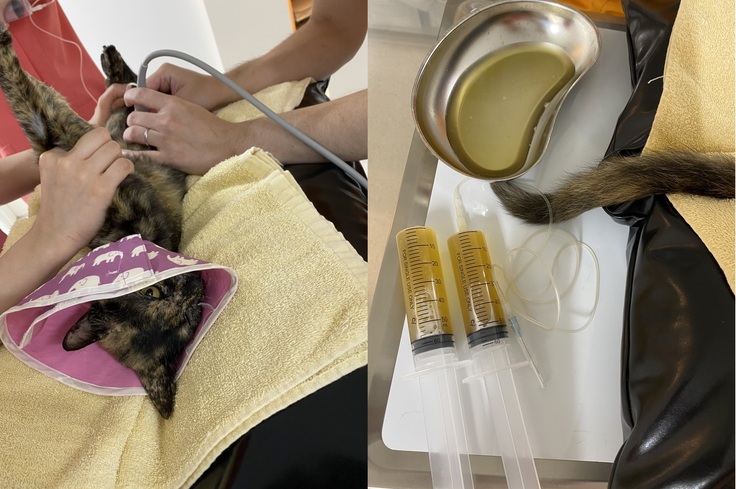 オシッコは膀胱にパンパンに溜まっていて数滴ポタポタと出るだけです。圧迫排尿も尿道カテーテルによる導尿もできない状態なので、毎日病院に通い、エコーで確認しながら膀胱に針を刺してオシッコを出してもらっていました。