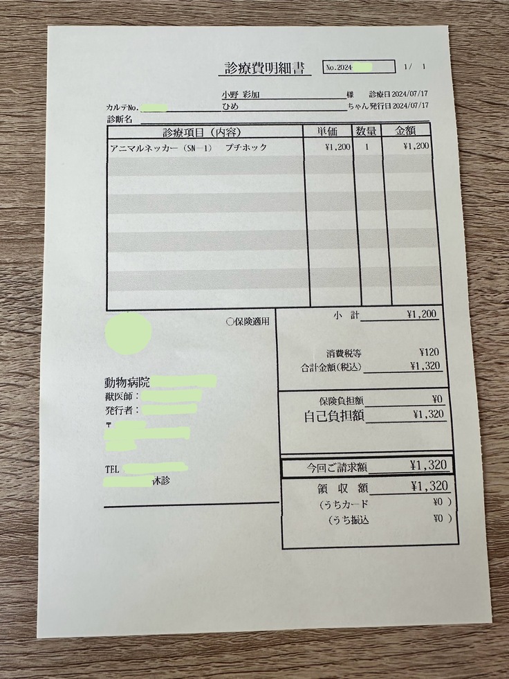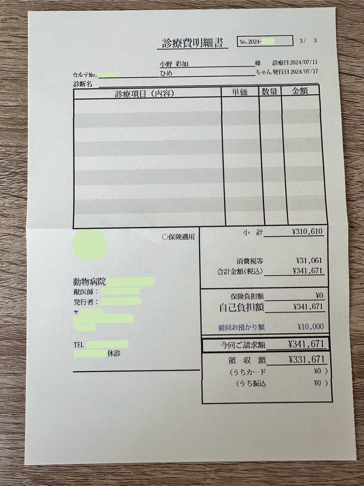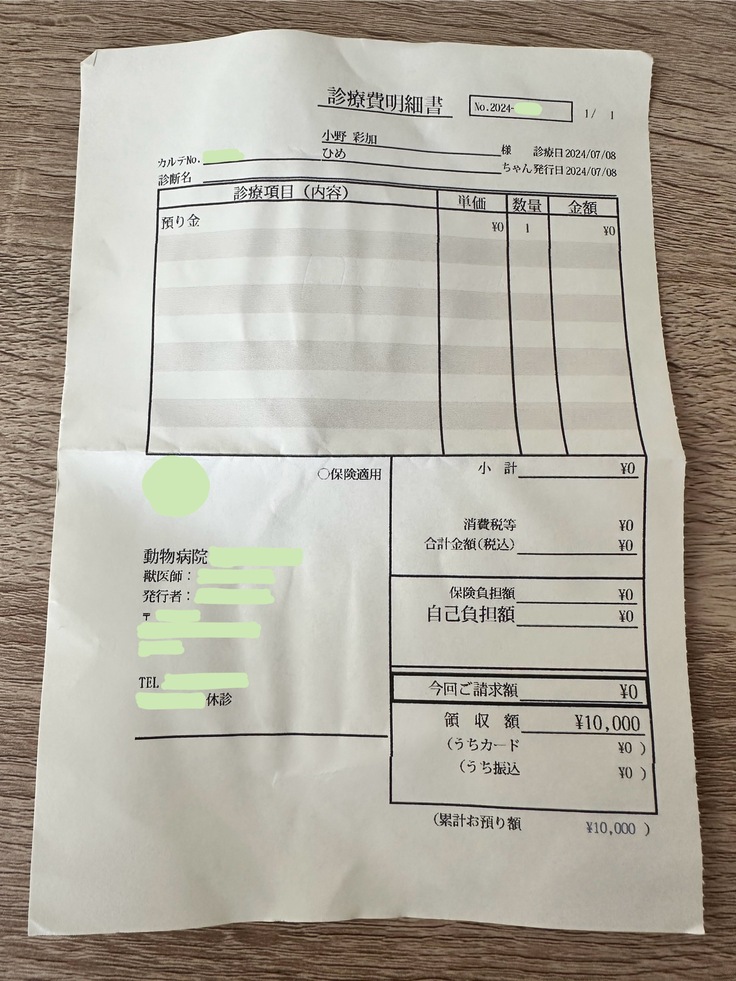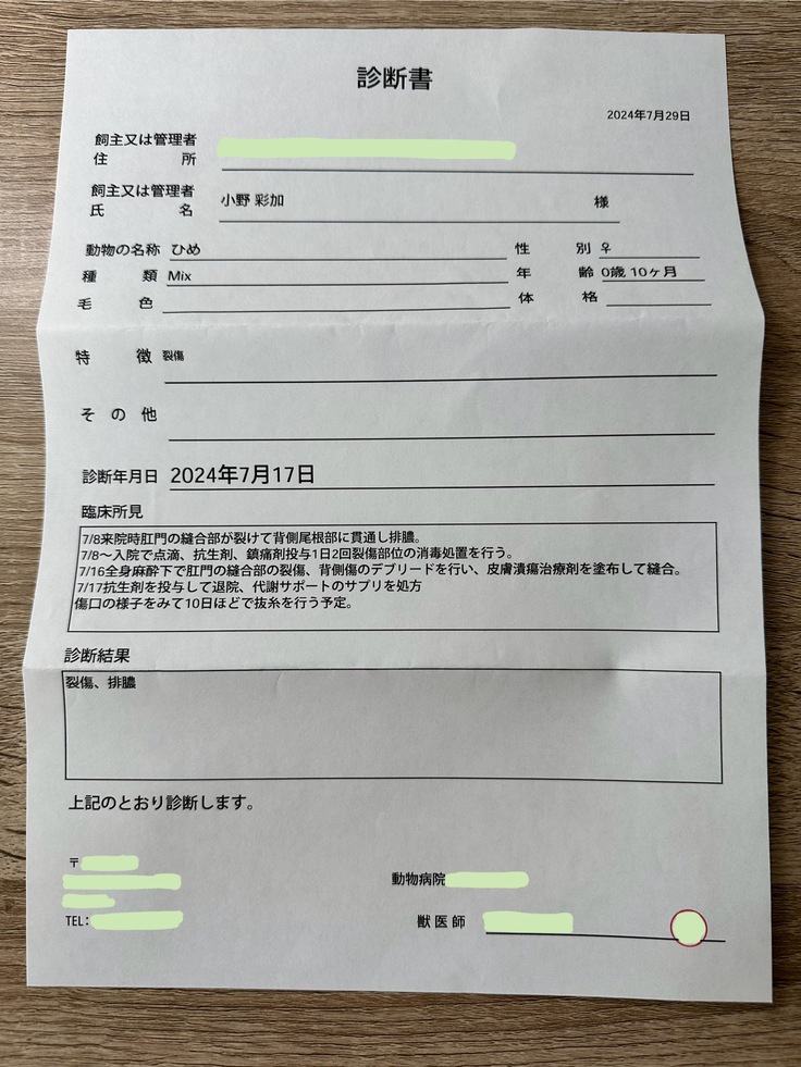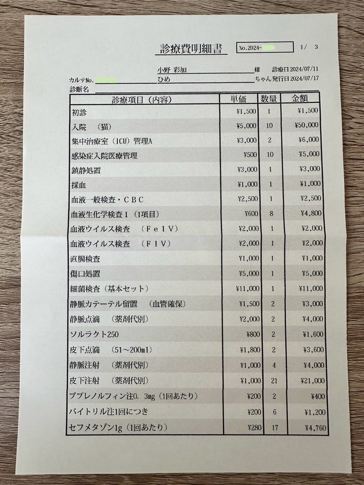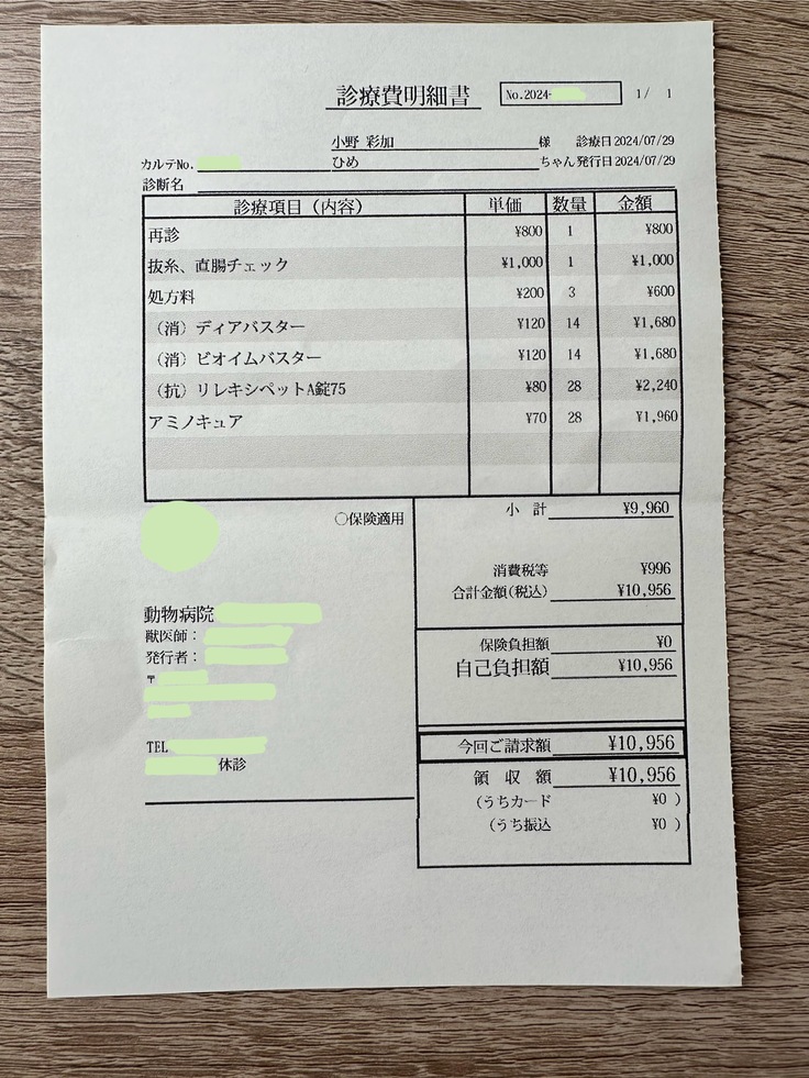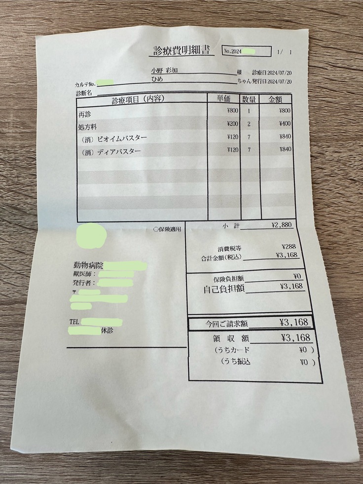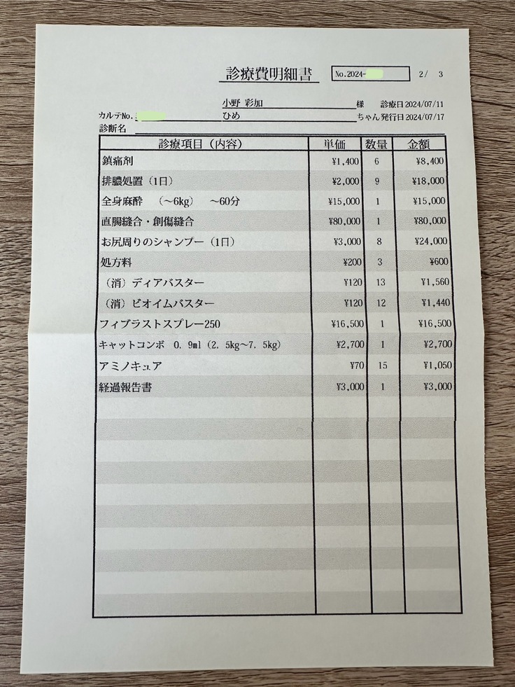 (※今後の治療費について動物病院に確認したところ、どの程度でひめちゃんの体調が改善されるのかがわからないので、まずは7月29日から2週間お薬を飲んで様子を見てもらうとのことでした。2週間経過後に傷口の経過も良く、下痢が改善されれば治療は完了とのことでした。その間にひめちゃんが病院に行かなければならない状態になれば追加で費用が発生します。また、8/12までに治らなければ8/12以降も引き続き通院と治療をして参ります。)