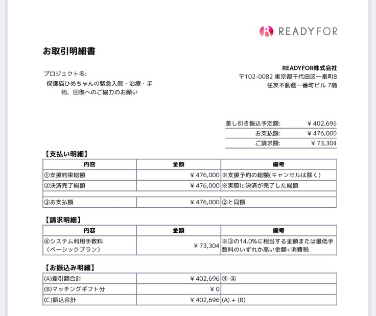 入金された支援金は全て、ひめの過去の治療費に充てさせていただきました。