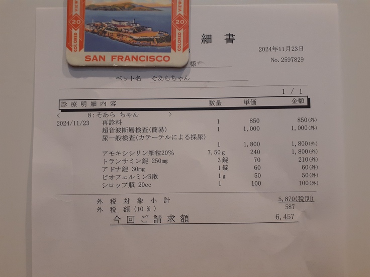 エコー、尿検査をして、膀胱が汚れていること、ちょっと詰まってしまったこと、雑菌が繁殖していることが分かりました。