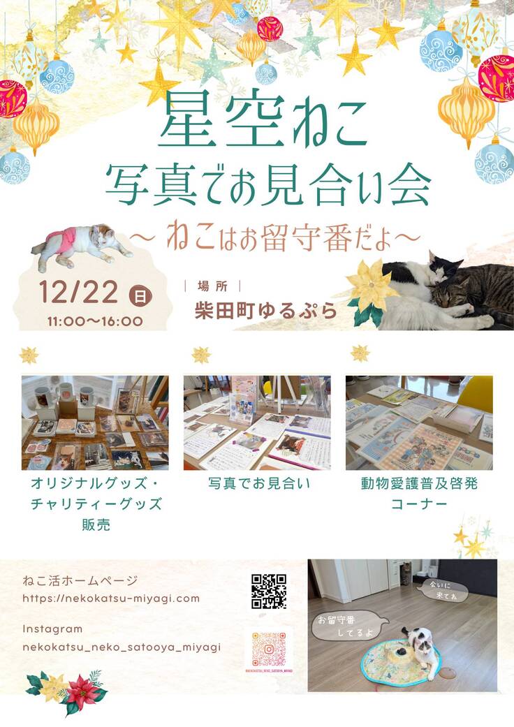 そしてお知らせになりますが今週22日(日)に柴田町イオンタウン柴田内「ゆるぷら」にて☆星空ねこ写真でお見合い会☆~ねこはお留守番だよ~を開催いたします。