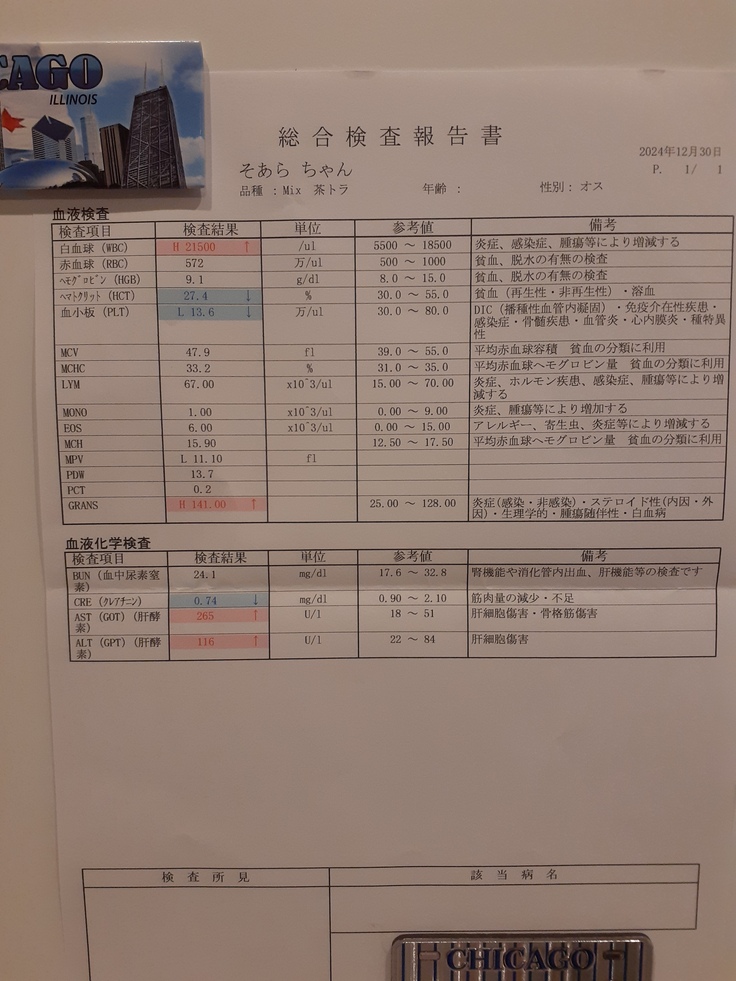 11月22日も血尿がでて、様々な検査をし、結果、膀胱洗浄等をして投薬により改善されたかと思っていましたが29日血尿と酷い痛みが確認されましたので入院、30日夕方退院してきました。