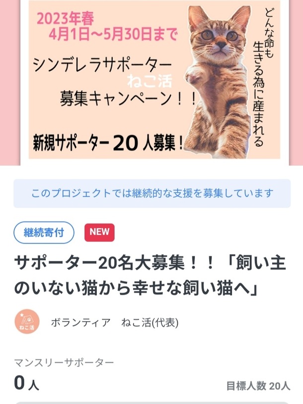 本日より継続寄付キャンペーンのプロジェクトを立ち上げていますボランティアねこ活佐藤です。