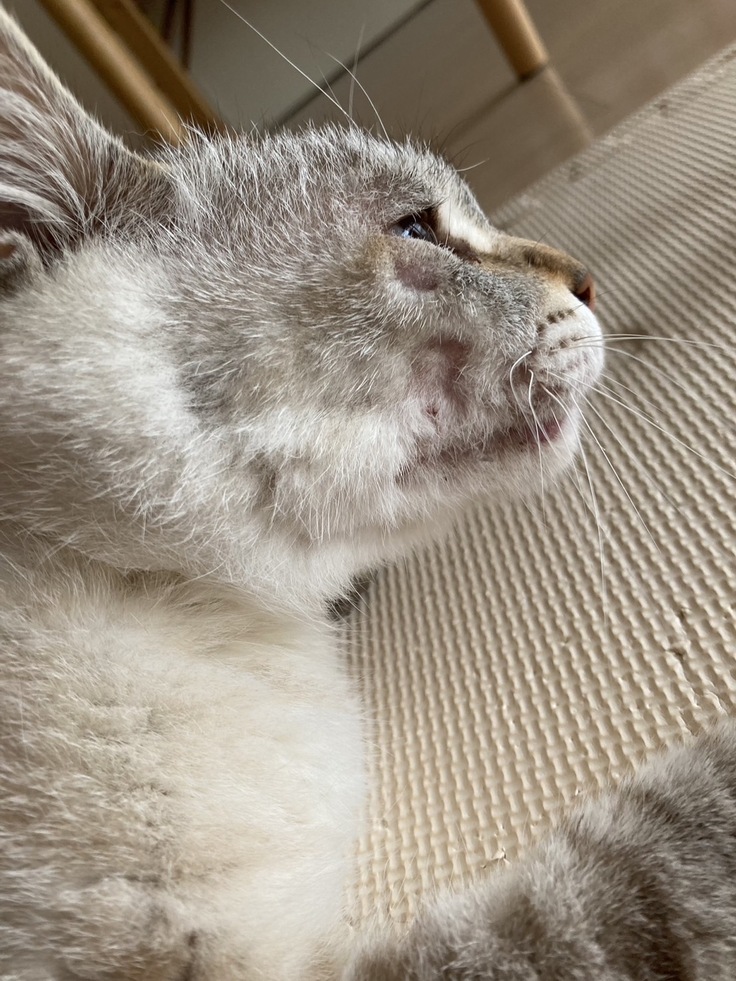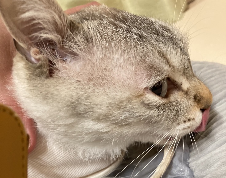 【つくし君】は4月中旬まではアレルギー治療としてステロイドを少しずつ減量して3日に1錠までと大分間をおいた投薬ができていましたがワクチンの副反応と思われる免疫低下により皮膚が敏感になり痒がり、特に顔の毛が抜けてしまいました。