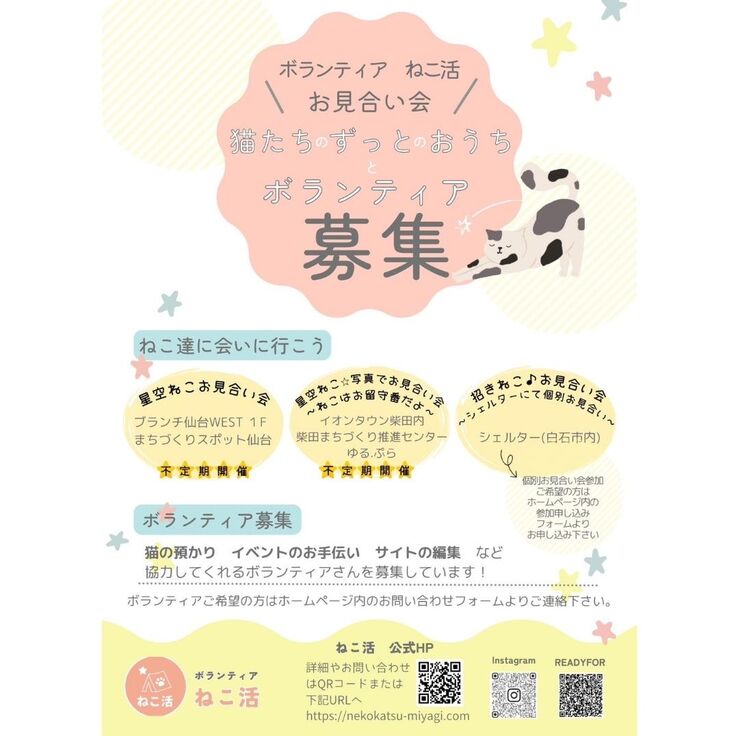 また譲渡範囲は岩手県、宮城県、福島県、山形県、栃木県にしていますので、基本のねこ活のチラシを貼ってくださる方、どちらかに置いてくださる方、またどなたにかお渡ししてくださる方がいましたらDMをいただけるとありがたいです。